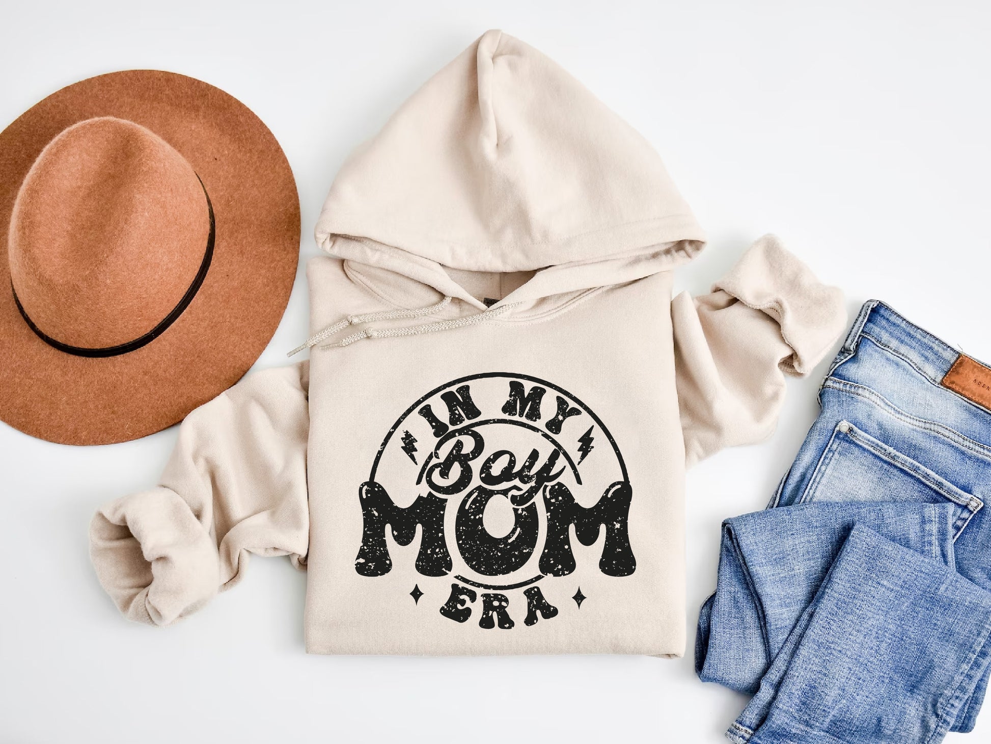 The Gildan custom hoodie for women features the text "In my boy mom era" in a vintage font. This women's hoodie offers practicality and comfort, making it perfect for boy moms who want to stay warm and stylish. It's a thoughtful gift for boy moms or a personalized mom gift that combines comfort with a vintage touch.